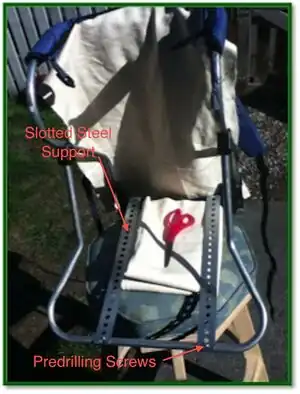 Acquire a backpack frame. Add extra supports on the bottom of the frame to guarantee there is adequate support for the unit to rest. Measure the distance from the back of the unit to the front. Then, using metal shears, cut two piece of slotted steal to the specified length. Using pre-drilling screws attach the two pieces of slotted metal to the back and the front of the frame. One screw on each side should be adequate to hold the steel supports in place.