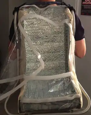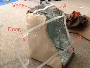 Measure the remaining distance to cover the face of the backpack and add 5". Cut out a piece of plastic that size by the width of the backpack. Cut a 4" wide piece of clear plastic. Cut a piece of clear plastic the desired size of the door, make sure to consider that it must be large enough to insert and remove the drying tray. Line up the plastic on sewn to the vent and the door along the width side. Sew the door to B on the left hand edge. Pin and sew the B to the other vent. Overlap the two lengths ¾", the width of the Velcro. Hand sew the two pieces along the left hand side where they meet (door opens to the left) right along the edge. Measure the remaining distance necessary then cut that distance from the remaining plastic seen at A. Cut a 2" piece of plastic by 2" longer than the door. Align with the right hand side of A and B overlapping each by 1". Sew into place. You should now have one continuous face. Now attach the sticky Velcro to the door seams. Pin and sew the face on the backpack