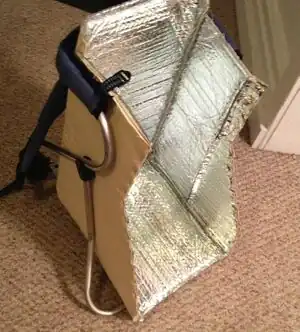 The educational unit is made from the frame of an old baby carrier. The front of the backpack unit is covered with a clear polypropylene plastic for sun collection. Inside the backpack unit is a tray made of mesh that acts as the food shelf, the tray is angled within the unit so it collects more of the sun's energy.