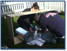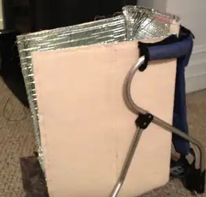 Make the bottom access door. Put the reflective insulation on the door with adhesive and then then use the duct tape once again to seal edges. Use staples to keep aluminum screening in place before wrapping the wooden dowels. After wrapping one piece of wood, screw it in to the door. Stretch the Aluminum screening as tightly as possible, and roll the screening around wood again, and screw down second side. You want the screening to be about 2-3 inches away from the edge of the door. (Photo by Leabeth Peterson)