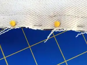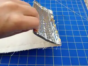 Trim both sides to prevent excess shadowing of the interior. Measure out desired dimensions to be removed that best fit the frame used. Mark on the insulation the areas that are going to be removed. Once marked pin the insulation to the canvas a ¼" to the inside of the trim mark. Using scissors cut off the excess material. Use the sewing machine and sew ½"seam along the pins. Remove the pins.