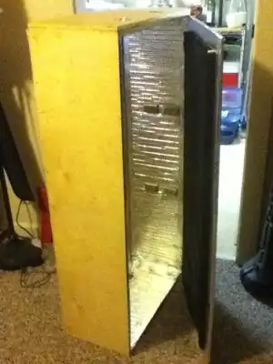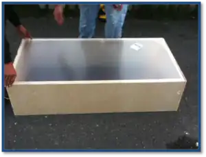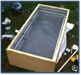 The main solar dehydrating unit is made from a pine box with dimensions of 12"X49"X24" with a wall depth of 0.5". There is an acrylic plexiglass face with a bottom opening door. There are 2 dehydrating screens for the food to dehydrate on. There are also two vents on opposite sides, with one vent on the bottom near the door and the other vent near the top of the plexiglass window.