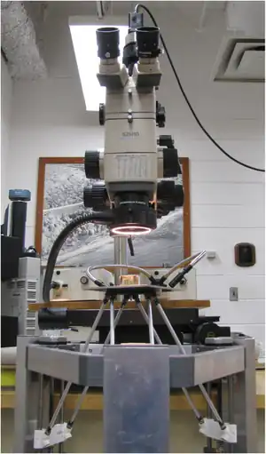Open-source technology not only has facilitated the expansion of the greater research community, but by lowering costs it has encouraged innovation and customizable design. The field of automated microscopy has continued to be a challenge in accessibility due the expense and inflexible, noninterchangeable stages. This paper presents a low-cost, open-source microscope 3-D stage. A RepRap 3-D printer was converted to an optical microscope equipped with a customized, 3-D printed holder for a USB microscope. Precision measurements were determined to have an average error of 10 μm at the maximum speed and 27 μm at the minimum recorded speed. Accuracy tests yielded an error of 0.15%. The machine is a true 3-D stage and thus able to operate with USB microscopes or conventional desktop microscopes. It is larger than all commercial alternatives, and is thus capable of high-depth images over unprecedented areas and complex geometries. The repeatability is below 2-D microscope stages, but testing shows that it is adequate for the majority of scientific applications. The open-source microscope stage costs less than 3–9% of the closest proprietary commercial stages. This extreme affordability vastly improves accessibility for 3-D microscopy throughout the world.
