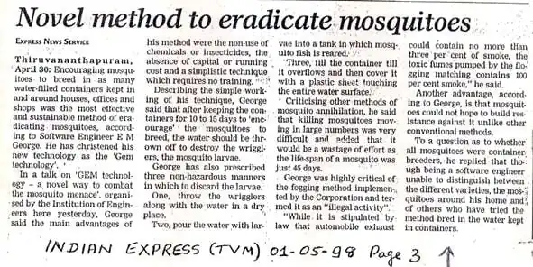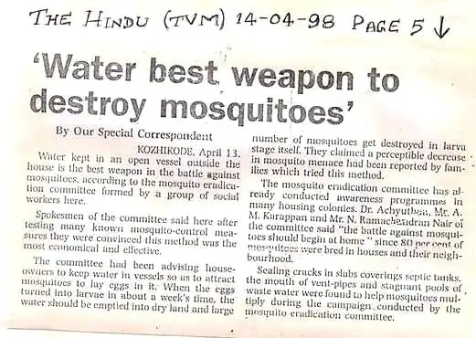 The Hindu Thiruvananthapuram (page 20, 4 Apr 2016) reported: "Now, a novel method to trap mosquito eggs"
