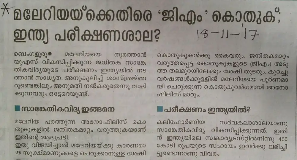 News on "GM Mosquito: India Test Ground?"