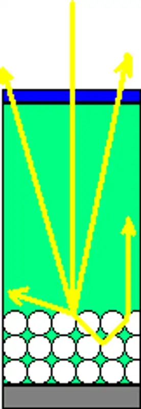 Fig 2: is a diagram showing how better photon (or light rays-the yellow arrows) absorption can be achieved by using materials that diffract (bottom circles) the rays of light so they stay in the material that absorbs the light's energy longer. by creating a lower exit angle (left) the ray's energy stay in the cell longer thus allowing for more absorption. Similarly, if the rays bounce around more (right) the energy is again in the system longer allowing for more time for absorption.