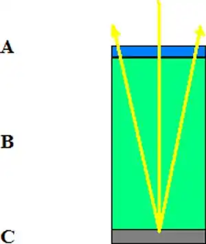 Fig 3: is a diagram of how light (the yellow line) enters the solar cell. It first passes through "A" (the blue region) which is the anti-reflective layer of the cell. The sunlight then travels through, "B," (the green layer) the material the cell is made of, e.g. silicon, gallium arsenide, etc. Then the rays travel the the backing material, "C," (the gray region) which is normally made of aluminum. At this point the photons which remain unabsorbed are reflected off of the backing nd ravel at an angle back out of the cell through both "A" and "B."