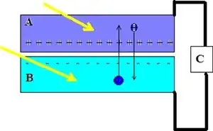 Fig 2: is a diagram that showcases how the current flows in a solar cell as rays of light or photons (the yellow arrows) strike the cell. Again the section labeled "A" is the n-type junction while the section labeled "B" is a p-type junction. The section labeled "C" is the load for the circuit. The electrons will flow starting at point "B" to point "A" then through the load "C." Then the electrons will complete the loop and return in a clockwise loop to point "B."