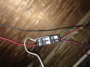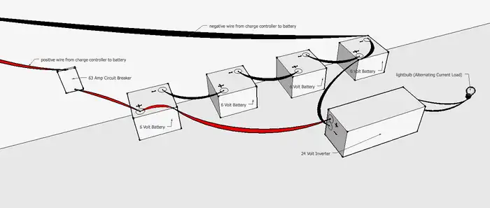 Connect the positive wire from the batteries to the 63Amp breaker, then into the charge controller. Make sure the breaker is switched to the off position.