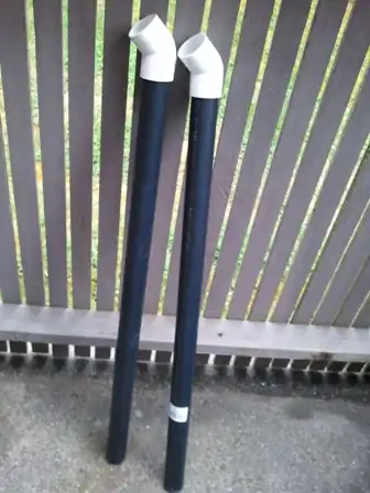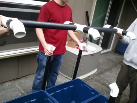 Each storage container used by the GGC is 18" wide and 16.5" tall. Listed are the dimensions for each PVC section cut that are measured to work with the stated container size. A local Ace Hardware is able to cut each piece to the specified dimension for no charge. A PVC pipe cutting tool was used by the GCC. All black piping pictured with corresponding joints is 1.5" wide. (Disregard white PVC pipe and water catchment) | |