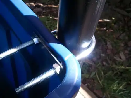 The PVC frame is measured so that all three legs fit snugly around the container base. The legs need to be secured to the base at the ends and center using metal U-hinges. Drill holes two inches apart on each side of all 6 legs surrounding the container base. Drill these holes near the top of the containers as shown. |