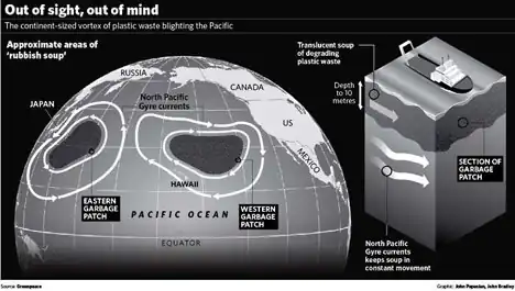 The "Garbage Patch" is a term coined by Curtis Ebbesmeyer; it refers to the world's largest landfill that has been infiltrating the North Pacific Subtropical Gyre. It consists of all sorts of trash from all over the world, 90% of it being plastic. Many people wrongly believe that it is a solid land form, but it isn't, most of it can't even been seen above the water.