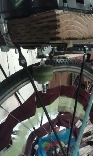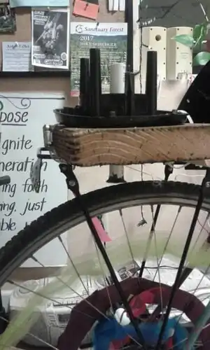 Blender base with PVC tube and rotating rod with skate board wheel. The wheel sits flush against the bike tire. As the tire rotates it spins the skate board wheel that rotates the rod and blender blades.