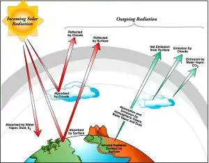 The PSP that is exposed to direct sunlight measures global radiation which is a composition of direct radiation, coming straight from the sun directly to the PSP and the diffuse radiation which is other light waves that have been bounced, bent, or reflected though the earth's atmosphere. The second PSP, with the shadowband blocking the direct radiation, only receives diffuse radiation. By using the data from each of these PSP's, the diffuse radiation is subtracted from the global radiation to obtain the amount of direct radiation which is the primary source of solar energy.[2]