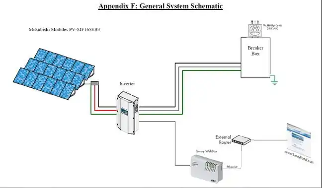 The PV system selected and built was the 10.6 kW system consisting of 72 panels (Mitsubishi PV-MF165EB3). Figure 2 shows the flow of energy for the photovoltaic system. The company which manufactured the panels is Mitsubishi. The panels are arranged into 6 rows of 12 with their faces oriented south west to capture the greatest amount of sunlight per day. As the panels are hit by sunlight, electrons are knocked off the material and are released into the circuit. First the electricity travels through an inverter to convert the from DC to AC so that the building can use it. The inverter then sends the energy to the breaker to either be utilized by the music building or be put into the campus wide grid. The inverter also has a component which monitors the amount of energy passing through it called a Sunny WebBox. The Sunny WebBox sends the data through an external router to a server which records and stores the data (Sunny Portal).