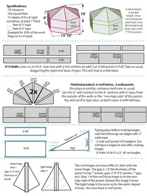 Given a choice between the H13 and H15, the H15 is more structurally sound, given that your tape-ring is not cut into with the addition of the door, and it's symmetrical on all axes. The roof hinges are the same as the classic 8' hexayurt, each of the 6 wall panels has the 2' addition either hinged on or taped on once you hit playa.