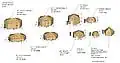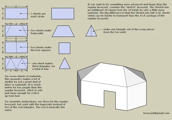 The schematics below describe the smaller 6' hexayurts. The larger, and now more commonly used designs are compared here, with links to instructions.