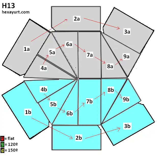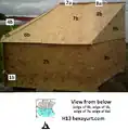 Because we have the nice vertical boards, 9b goes in last, and can be screwed into place from the outside, so nobody is left stuck inside of the hexayurt in the same way as you get with the normal roof cone construction. This is very important and it's a much easier build because we don't have the same problems getting to the last two boards.