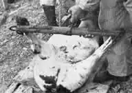 Now you are ready to begin the butchering process. Sidney used a single shot .22 caliber rifle to shoot the hog between the eyes, killing in instantly. Be sure to have a knife ready, because as soon as it is down, you must cut its throat to bleed it. (see photo #2) You should hit the main artery while the hog is still kicking to force out all the blood. The hog must bleed so that the blood won't coagulate and get into the meat.