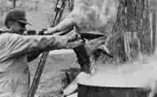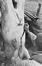 The barrel should be set under a strong tree limb. This is so the pulley can be put overhead to raise and lower the hog from the barrel. Because a small fire must be built Under the barrel it must be set about six inches off the ground. You can do this by simply setting it on some flat rocks, leaving enough room to set a fire underneath. Fill the barrel about one half full of water and begin to heat it. Set all your utensils near the barrel, especially the table which should be only a few feet away. This is so you can swing the cleaned carcass over to the table and lay it on it to cut up.