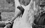 First to cut is the backbone which has to be cut apart from the rest of the meat. You do this by chopping with an ax down the length of the backbone on both sides where the ribs join it. The backbone and the tenderloin together make pork chops, but Elmer doesn't cut it that way. He likes to keep them separate. The backbone has meat on it as good as the tenderloin, so he cuts it up and boils it like stew meat, but with the bone still with it. The way to make pork chops is to saw down the center of the backbone and cut off the extra rib ends about five inches from the backbone. Sawing the backbone is done while the hog is still hanging from the pulley.