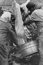 Scalding loosens the hair just as scalding a chicken makes feathers pull out easily. Elmer rolled the hog on a wooden sled and moved it over to the barrel with a tractor. To make it easier to raise and lower the 275 pound hog in the barrel of water, it is attached by rope through the pulley to the tractor. In earlier days a horse was used for power. First run a wire through the hog's mouth and under its chin and fasten the ends together. Then take one end of the rope from the pulley and tie it to the wire. Raise the hog above the barrel of hot water and lower it into the water. Lower the hog until as much of the hog as possible is covered. (see photo #3) Be careful you do not let the hog touch the bottom of the barrel or that you do not let the water boil. Too high a temperature will set the hair so that it can't be scraped off. At least one half of the hog will have to be covered so add more water if needed. Do not leave the hog in the water long, just until the hair pulls out easily. Some people add a few ashes to the scalding water so that the lye in the ashes will help loosen the hair for scraping.