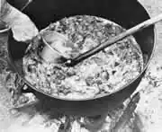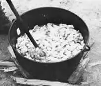 While the other women were cutting the fat inside, Elmer was setting up the iron kettle outside. The kettle has to be about 4 inches off of the ground to allow room for the fire wood. Put a small amount of water in the kettle to keep fat from sticking when you first put it in before any grease has cooked out. Build a fire under the kettle to get the kettle hot before fat is put into it. As the fat is diced, bring it outside and dump it into the kettle. What little water is left will boil out. Stir constantly with a stick or a paddle. Letha stirred the fat with her prized lard stick. Her lard stick was made of sassafras and she first used it to stir lard in 1927. (see photo #19) As the fat gets hot, it melts down into liquid grease. Stir it constantly to keep the fat from burning. Keep the fire low while in this process because the lard, if a flame is touched to it, it will catch fire and too hot a fire will cause the lard to be brown when it hardens.
