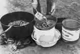Dip the lard out of the kettle with a large dipper or sauce pan and pour through a straining pan and a cloth into a lard stand or container that can hold very hot liquids. (see photo #22) Cover the lard can and let it cool and harden. The lard is stored in lard cans in cellars, and this lard will keep all year.