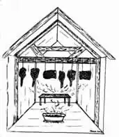 They would put the chips in a kettle on a bed of ashes and set the wood on fire. When the fire was burning well, they took ashes and smothered the fire so that only smoke came out of the kettle, because the flavor was not in the fire itself, but in the smoke. Since many smokehouses were not tight, walls were sometimes papered temporarily to hold in the smoke as much as possible to reduce the smoking time. The kettle was placed directly under the meat that was being smoked. For instance, the kettle would be placed under the hams. The fire would be tended until the hams would be brown. It usually took two or three days for the meat to turn brown. When the hams turned brown, the kettle would be moved under the sides. In the Winter, the farmer might have three or four hogs in the smokehouse at the same time, depending on the size of his family.