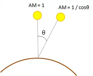 The losses due to atmospheric effects do not cause any major dips in the radiation spectrum. Rather, the impact is an overall reduction in the intensity of the entire spectrum. Depending on the time of the day, the sun's apparent position in the sky changes and as a result the length of atmosphere that the radiation must travel through also changes. When the sun is directly overhead, this length is referred to as the air mass (AM). Moving away from this overhead position, the travel distance required to hit the collecting surface increases. Figure 3 is simple schematic showing this effect.