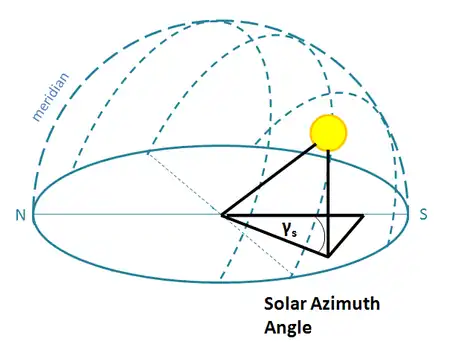 | Solar Azimuth Angle (γs) | The deviation angle from due South for the projection of the sun's position on the horizontal plane (-180o for Each, +180o for West) | |