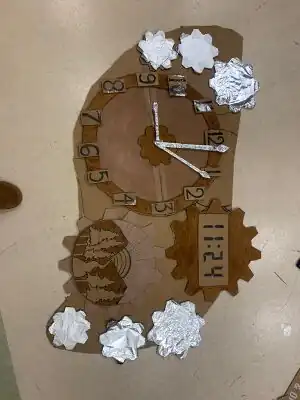 The prototyping process of the Makerspace Clock underwent a significant amount of design stages. The first prototype of the final clock design, a to-scale model of the clock and the clock’s respective 3D-printed gear chains, was constructed out of cardboard and developed based on the final blueprinted model of the project. The cardboard prototype featured a 20-inch cardboard analog clock to serve as the main attraction of the project, and an additional 4-inch ring around the circumference of the analog clock to act as the border the digits could be glued onto with the purpose of creating a 3D effect. Two similar cardboard gear-faces at 14-inch diameters each were also cut out and taped onto the backdrop, one designated as a digital clock face and the other as a vanity art-piece of the surrounding Humboldt environment. Additionally, six gears were cut out of cardboard at varying diameters per gear (8-inch, 6-inch, and 4-inch, respectively), and wrapped with aluminum foil to create a metallic look, then aligned into two trains. The backdrop itself was cut out of a few pieces of cardboard taped together and cut to an irregular shape within the frame of the desired 50-inch space that allowed all the components to be glued comfortably on. After completion, the cardboard prototype prompted discussion about if the proportion and flow of the layout of pieces were found aesthetically pleasing.
