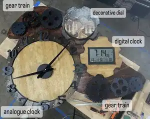 The artistic and aesthetic results of the project concluded perfectly as expected, the final product featuring the appropriate amount of artistic design that was planned for, and the gear cutouts performing sufficiently in correspondence with the visible aesthetics of the entire clock itself. The timekeeping mechanisms of the analog clocks and digital clocks also perform flawlessly as well, with no errors in their individual timekeeping abilities. The only set of results that are shown apparently to be flawed are the gear trains sourced from the servo motors. Shortly after running the gear trains for an extended period of time, one of the servo motors ceased to operate as intended, due to a hardware malfunction.
