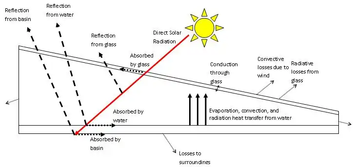 The most important factor that affects level of production of the solar still is the amount of solar radiation on the glass cover, called irradiance. Not all of the solar energy that contacts the glass will actually be used for evaporation of the water in the basin because it gets reflected and absorbed by anything it passes through. Figure 4 is an energy flow diagram that shows that part of the sunlight is reflected and absorbed by the glass, the water, and the basin surface. If the still is not perfectly sealed and insulated there will be heat losses to the surroundings.