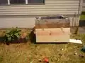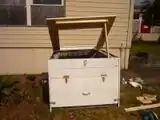 We have designed a one bin compost system with a lid in order to facilitate a hot fast composting process. The material is added to the bin and is static until the compost is ready. The first step was too wrap the pallets in a wire mesh using staples to hold in the material, keep out pests, and improve air flow. Then the pallets were placed upright and screwed together with brackets to a bottom pallet. We then sheeted out the plywood and wrapped it around the pallets. All the plywood was water treated and primed. Support blocks were put behind the plywood to hold the wood in place. We designed the bin to receive extra light and heat by having a clear Plexiglas lid. To improve the airflow of the bin we drilled four holes on each side of the bin. The front of the bin was designed to allow for the user to have enough room to shovel the compost without it being to tight. The top half of the front is plywood which supports a baffle which will hopefully keep materials away from the door making collection easier. The door was installed using hinges and includes an eye hook with a carabiner and chain to keep it up while in use. The lid was installed using hinges and can be supported up with a piece of wood. The plexiglass lid is framed in wood giving it support and durability.