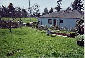 Because the yard is on a slant we had to level it to lay the foundation. On the side farthest away form the blue house we had to dig down about three feet. Moving all of the soil by hand took much longer then we originally thought and if I were to do it again I would consider renting a small bulldozer.(Fig 2) Once we leveled the ground it was time to dig out the area for the foundation. Scott is standing on the northern side and the fence is to the west. The northeast corner was the hardest corner to dig out and get the forms in place. It is all clay after the first foot and a half and was extremely difficult to work with. This corner took us almost the same amount of time to as the entire rest of it. When digging out where the foundation was to go it was really important to make sure it was level, square, and all four sides were even with each other so that our foundation would be level, flat, and square.(Fig 3) After the ground was dug and leveled, we put in the forms for the foundation, the posts for the retaining wall, and the rebar. The inside forms are 12ft by 9ft and the outside forms are roughly 14ft by 12ft. Because the north and west walls are going to be straw bale the foundation on those two sides has to be 18in wide. This is so that a bale can sit on its side and not hang over the edge of the foundation. We have three pieces of rebar running down each side of the foundation, which are sitting three inches off the ground and the poles for the retaining wall go into the ground about two feet and are leveled.(Fig 4) The concrete for the foundation we bought premixed and ready to pour. To get it from the wheelbarrow into the forms we used a small piece of metal stovepipe, which we got from the recycling center, that made a perfect chute. In total we used about two and a half yards of concrete. Everything went really smoothly, the forms held and we had no disasters. Once the pour was complete we pushed L shaped rebar pieces into the foundation on the North and West sides so that they were sticking up vertically. These are to help hold the bales in place.(Fig 5&6)