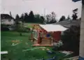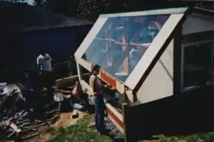 After the roof and glass were up we put on the roof cap and siding. Some of the siding was 4'x8' sheets of exterior plywood called T1-11 but we also used some of the roofing material on the east side to let more light in. Once the siding was up we stained that as well.(Fig 13)