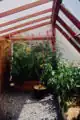 We stained the wood before putting the roof and glass on because we did not want to get stain on either of them. Stain also helps the sealant attach to the wood and forms a better bond. We considered using linseed oil to seal the wood but because it has to be continually reapplied we decided it would be inappropriate for the greenhouse. The property that the greenhouse is on is usually a rental and it would be hard to maintain while not living here. The stain we used is Behr deck plus and is water based. For the roof we used a plastic material that is shaped like cardboard and has an R-value of about 2.5 which is better than the non-insulative corrugated fiberglass roofs normally used on greenhouses. This material is also flat which makes it easy to install.(Fig 11) Putting up the glass turned out to be more difficult than expected. To hold it in place we hammered two wooden blocks below each sheet of glass. Then around the sides of each window, between the glass and the wood, we put double-sided foam tape as a sealant. Outside of that we were suppose to put a special kind of caulking but it turned out to be a disaster. It was very messy, got everywhere, did not make a proper seal, and was a pain to work with. What we should have done is had the rafters a little farther apart so that we could have a piece of wood in-between each piece of glass. This would allow us to screw another piece of wood on the top of the glass to help hold it down and add more protection from leaks.(Fig 12)
