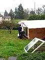 Before we put the garden boxes in we compacted the floor with a hand tamper, which consists of a steel plate at the bottom of a stout pole, and shaped the floor so that it was at a slant ending at the hole in the foundation. Once the garden boxes were in place and full we laid gravel on the floor. Scott shoveled the gravel in through the window and then leveled it out making the floor flat. We decided to use gravel to keep the floor clean and retain some heat.(Fig 36)