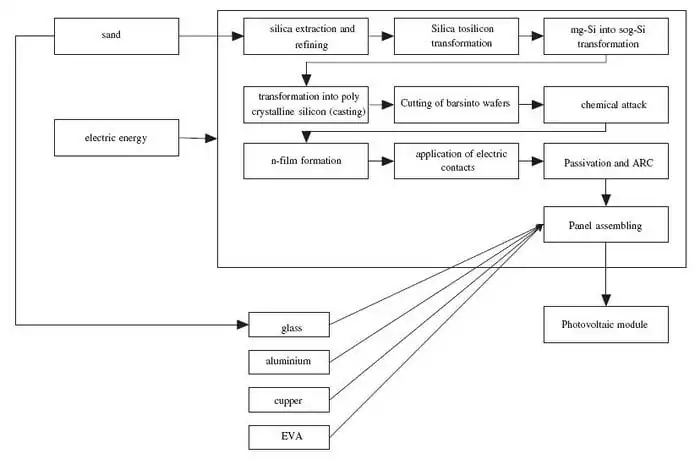 Manufacturing photovoltaics is overwhelmingly the most energy intensive step of installed PV modules. As seen in Figure 2, large amounts of energy are used to convert silica sand into the high purity silicon required for photovoltaic wafers. The assembling of the PV modules is another resource intensive step with the addition of high energy content aluminum framing and glass roofing.