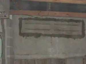 The strongest test was a mixture of just sand, flour paste, and cal, but we decided not to use it based on a lack of existing research or data on using a mixture without clay. One square of the mixture was put above the back door, so in a year the durability of the patch can be compared with the rest of the wall. The mixture for the patch is: 1/50th parts lime dissolved in 1 part water, 2 parts flour paste, and 5 parts sand.