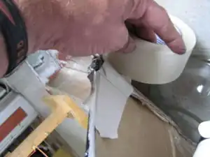 The mathematician can be made in many ways. Mine includes a piece of waste trim that is the slide bar at the top, a T-joiner for plastic pipes and a curtain rail that fit snugly into the T-Joiner. The string is strung from a hook on the central post at your favoured focal point, through a hole in the curtain rod and is tied on to the top of the T-Joiner. Some rules! The T-Joiner has to be at right angles to the slide bar which in turn must be at right angles to the central post. Directly under the hooks on the central post, there is a screw which goes down about a half inch through the bottom of the wood piece at the bottom of the post. And right under that screw, there is a hole in the dark piece of wood (just a little bigger than the screw). The dark piece of wood sits on the aluminum foil, screw goes in the hole and the top gadget can swivel around while the bottom piece stays in one spot. (This means less scuffing of the foil when the mathematician takes measurements!)