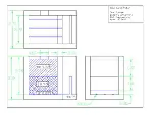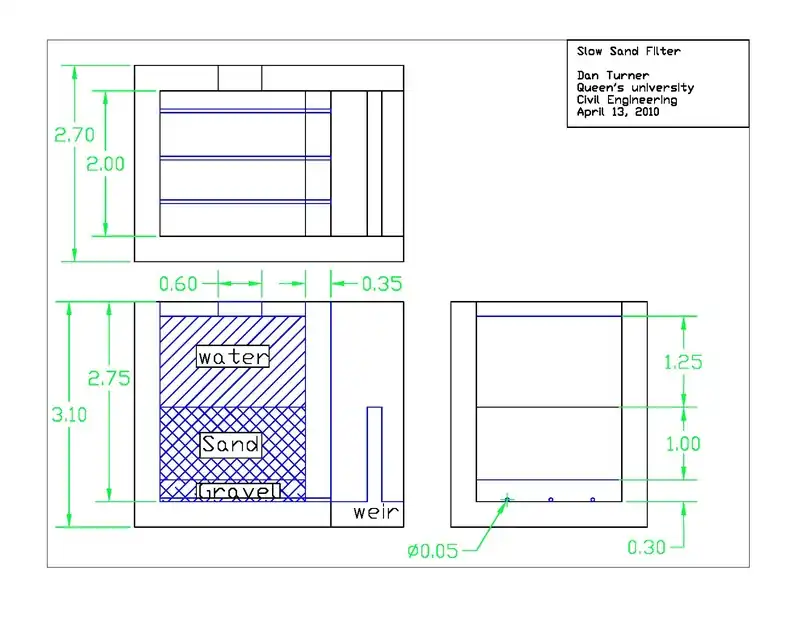The filter design also has an input velocity and dimension depending on the required amount of water to be filtered per day for the community. Standard depths for the gravel, sand and reservoir layers are included and an effluent weir is used to control the constant head reservoir. A second weir is used to drain excess water from the filter back to the source in order to protect the effluent from re-contamination. The effluent weir also serves to aerate the clean water which increases dissolved oxygen and improves taste. The filter is comprised of a sand layer which acts as a physical and biological filter and a gravel layer which prevents movement of sand into the effluent water. Perforated PVC pipes must be laid into the gravel layer to collect filtered water and pass it to the effluent weir. The filter structure will be made of concrete and a sample concrete mix design is included. The mix design has been tailored to a structure exposed to water. Cost of materials is based on typical Canadian values and can be changed depending on the region. Environmentally, the design is most impacted by the cement use. The treatment facility design does not include methods of collecting source water or distributing/storing water.