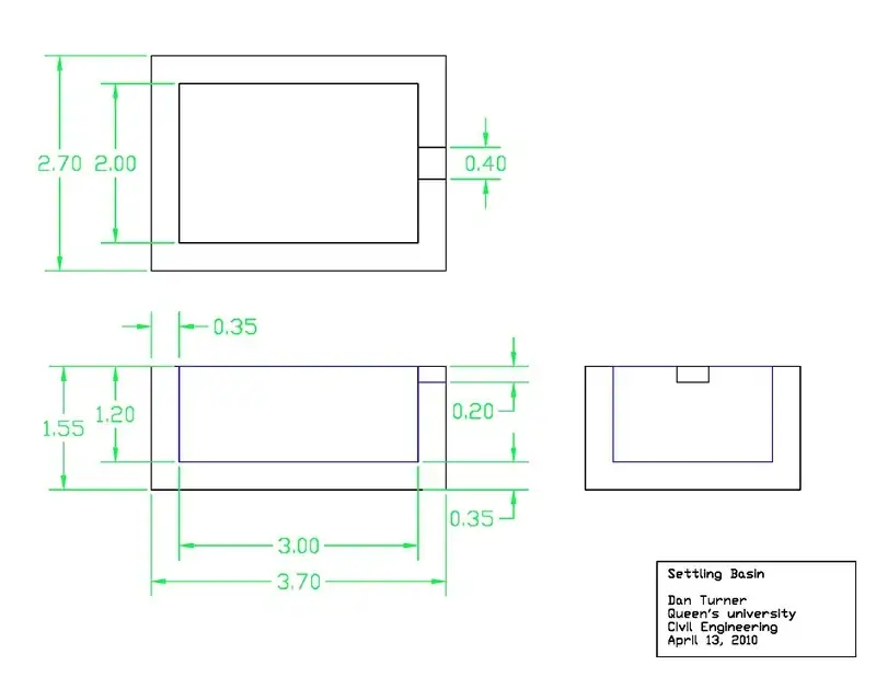 Filter material must have a nominal diameter that corresponds to an adequate hydraulic conductivity. If a sand with a small enough diameter is not available for the filter, a sieve may be used to separate the smaller particles and create an adequate filter material. In areas where standard sieves are not available, a sieve apparatus similar to the settling basin design could be used to separate the smaller particles. The settling velocity of a particle is proportional to the particle diameter and the flow rate across the settling basin. By controlling this rate with basin dimensions and a constant head reservoir, all particles greater than a given diameter will be settled in the basin and smaller particles will remain in the effluent. By removing larger particles in previous basins, particles settled in subsequent sieves will be an adequate size for the filter material. By maintaining a constant head with water that has suspended sand particles, the basin will collect the design diameter which can be collected and used in for the filter material. The sieve design parameters are outlined in the excel file and design drawings are provided.