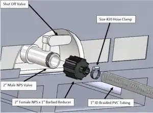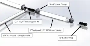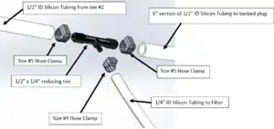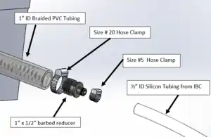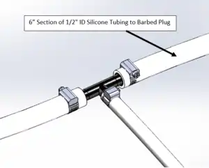 Attach 4’ (or appropriate length) section of 1/2” ID Silicon Tubing to 1” x 1/2” barbed reducer with Size # 5 Hose Clamp