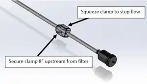 Install tubing clamps and filters (using a hose clamp to connect) on each of the three open tubes on the arm. These tubing clamps allow the flow to be turned on and off.