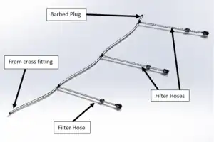 Use hose clamps and reducing tees to construct the filter arms end tee. Note the use of a barbed plug to close the end of the arm.