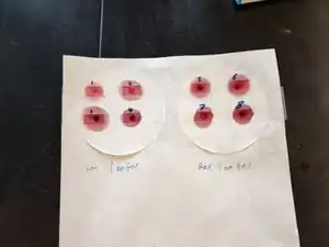 For the production of the test strips, due to issues with the printer, they were produced by hand. A 2cm by 3cm grid was outlined on top of the filter paper using clear tape. The chemicals were reconstituted in water with the following concentrations, GOX = 0.29 mg/dL, HRP = 1.45 mg/dL, and ABTS = 0.004 mg/dL. Using a Q-tip, ABTS was painted on all the regions, followed by HRP. GOX was then painted onto half of the regions. Single drops of blood were then placed in each of the sections.