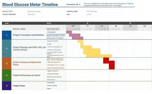 A Project timeline was developed for this project in order to have a visual representation of what should be accomplished in this project. The first phase of our project started with the initial research. This includes the types of devices already on the market and the test strips associated with those devices and the way the devices measure the blood glucose levels. The research with the FDA database about regulations and specifications on blood glucose meters followed. Information on the test strips, such as their history and the accuracy, was reviewed as well. We reviewed methods for making our own glucose solution for testing, instead of using blood, and what causes inaccuracies within meter tests. The research part of this project took the first five weeks in order for us to be thorough with our findings. Even now, we continue to search when we want additional information or have an idea. See the Background Research section for further details.