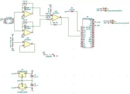 The electrical component of this design was very similar to our earlier design, in both cases a small current measurement was to be amplified by an OpAmp and measured by the feather. To measure the amount of 405 nm light absorbed by the strip we used a S-5420A-P6T2S photodiode from ABLIC coupled with a 405 nm LED. The photodiode has two current outputs that need to be converted to voltage and subtracted from each other. These functions were accomplished with a MCP6004 OpAmp and the output was fed into an ESP32 Feather from Adafruit. Images of the circuit diagram and PCB layout are included below.
